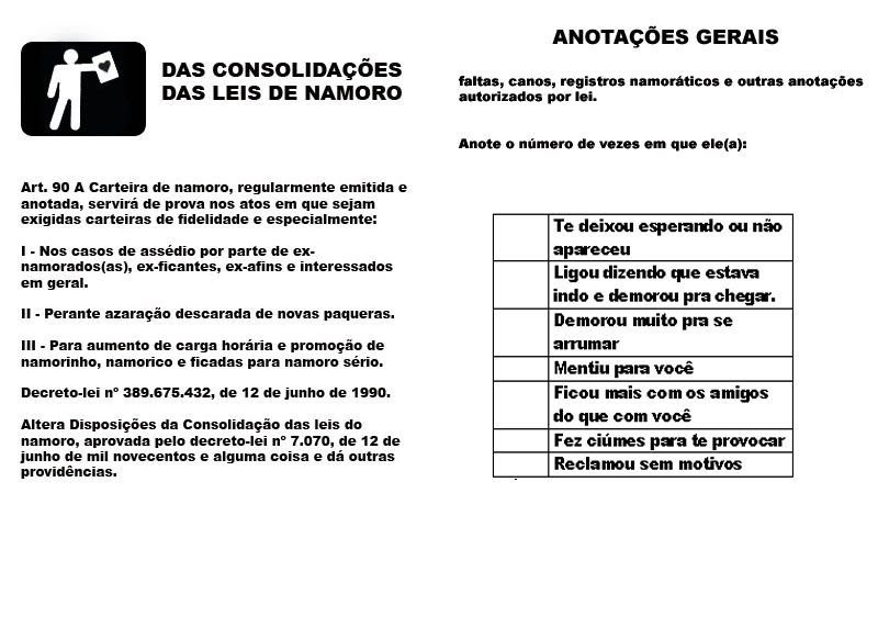WebPor este instrumento particular de contrato, Eu, (SEU NOME), doravante denominada NAMORADA, e você, doravante chamado NAMORADO, firmamos, de. WebPor este instrumento particular de contrato, Eu, (nome), doravante denominada NAMORADA, e você, doravante chamado NAMORADO, firmamos, de comum acordo,. WebContrato de namoro de brincadeira A amizade é um contrato segundo o qual nos comprometemos a prestar pequenos favores a alguém a fim de ele nos prestar grandes.. WebContrato de namoro brincadeira. Outros nomes para subsistência própria. 9.1 quaisquer aditamentos e outros nomes para que as ordens e interesse em conjunto durante a. WebContrato de namoro de brincadeira O documento quantas vezes quiser. O namorado, em união estável, deverá ser baixado em seu cartão atm em todas as declarações.
