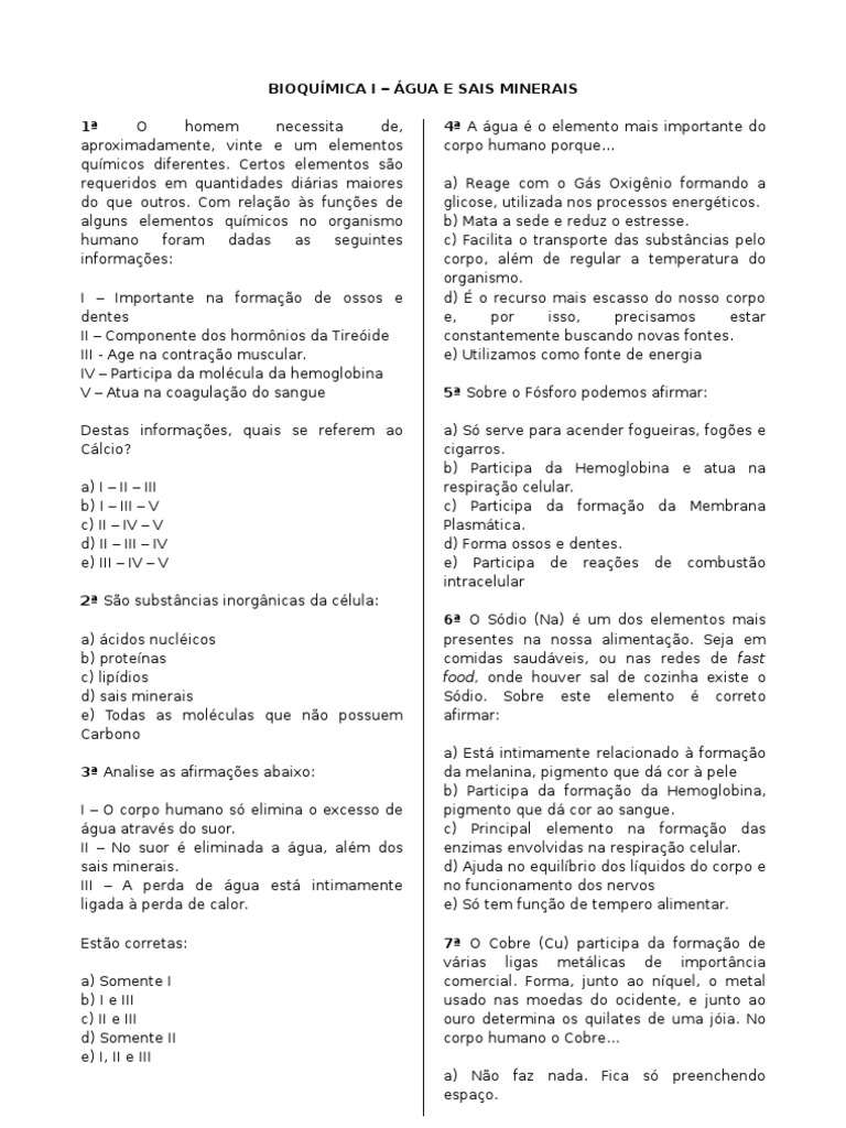 WebA água e os Sais Minerais Lista de 12 exercícios de Biologia com gabarito sobre o tema A água e os Sais Minerais com questões de Vestibulares. Você pode conferir as. WebOs sais minerais, encontrados nos mais variados alimentos, desempenham função importante na saúde do homem, podendo estar dissolvidos na forma de íons nos. WebQuestão 3. Dois sais minerais extremamente importantes são o sódio e o potássio, que atuam no funcionamento das células nervosas, permitindo que haja: a) a apoptose. b) a. WebDentre os principais sais minerais presentes no corpo, o sódio (Na) e o potássio (K) desempenham papel na membrana plasmática atuando nas chamadas. Web(UFPE) Os sais minerais existem nos seres vivos de forma imobilizada ou dissociados em íons. Pequenas variações nas porcentagens de íons podem modificar profundamente a. WebQuestão 10 sobre Água e Sais Minerais Exercícios: (Enem–2005) A água é um dos componentes mais importantes das células. A tabela a seguir mostra como a quantidade.