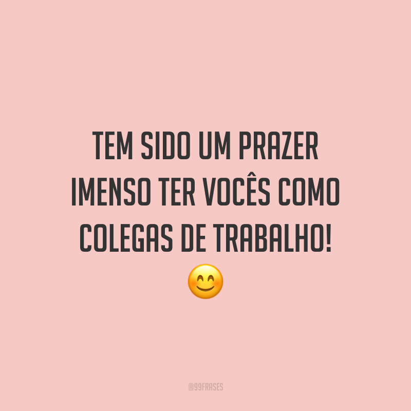 WebDespedida de amigo de trabalho. Se por um instante Deus esquecesse de que somos uma marioneta de pano e nos presenteasse com mais um pouco de vida ao seu lado,. WebO seu trabalho não é a pena que paga por ser homem, mas um modo de amar e de ajudar o mundo a ser melhor. Thiago de Mello Com trabalho, inteligência e economia só é. WebTer você ao meu lado todos os dias, me faz com que meu empenho cresça muito, ao observar o empenho que você prega em suas tarefas diárias no trabalho. Espero que. Web35 frases para colegas de trabalho que enaltecem a parceria de vocês. No ambiente de trabalho, damos muita sorte quando encontramos alguém que nos ajuda, nos ensina e. WebMeu querido colega de trabalho, espero que você passe esse feriado com ótimos sentimentos no coração. Por meio desta mensagem, venho desejar aos colegas.