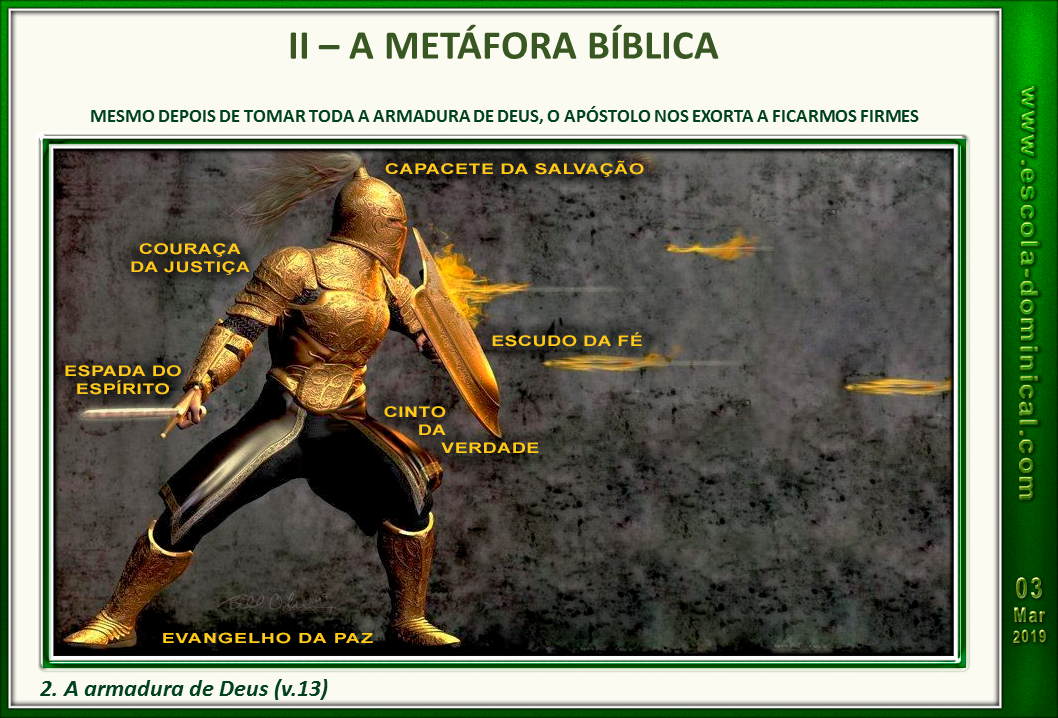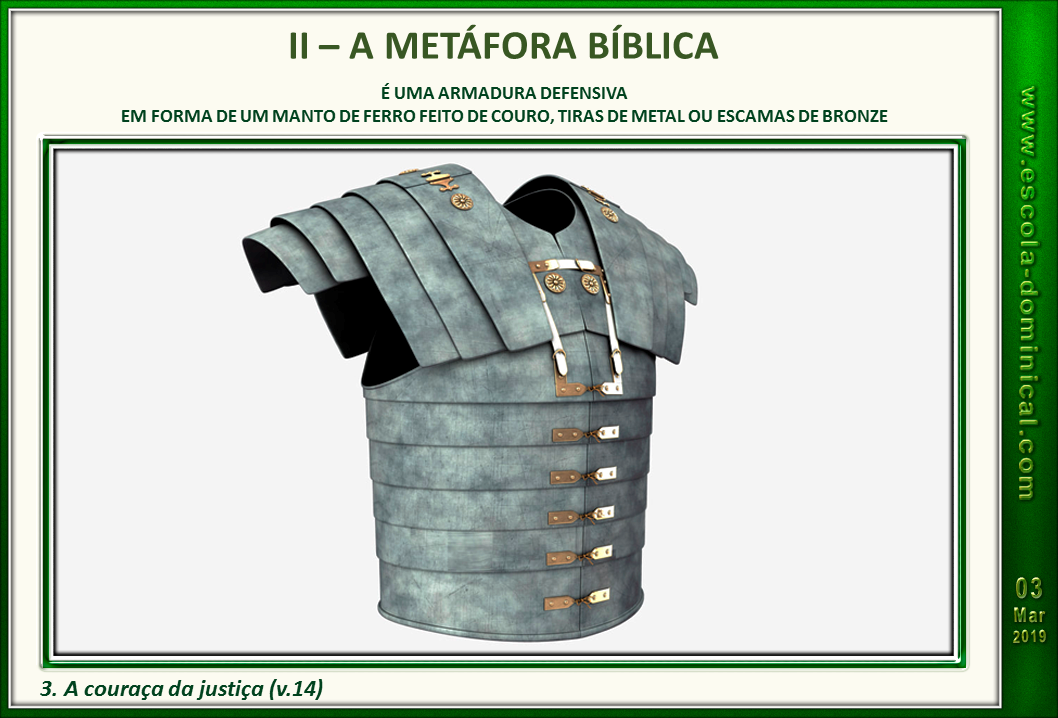 WebA expressão usada por Jesus: Estejam cingidos os vossos lombos, e acesas, as vossas candeias (Lc.12.35); equivale dizer: Estejam de prontidão, em atividade e. WebO que significa couraça da justiça segundo a Bíblia? Couraça é uma peça de armadura utilizada pelos cavaleiros e infantes no passado. Desse modo, apresentou a. WebA couraça protege seu coração; a justiça de Jesus lhe protege do pecado. Quando você se arrepende de seus pecados e dedica sua vida a Jesus, ele apaga a injustiça do. WebA couraça era uma parte da armadura que protegia a frente, o peitoral do soldado. Na armadura romana nada protegia as costas, simbolizando que o soldado. WebQuando falamos de luta e guerra espiritual o capacete é que protegerá a sanidade do crente no Senhor, guardará sua sensatez e sua sobriedade. E tudo isso. WebCom a couraça da justiça fixada em seu lugar, a glória de Deus irradia de sua vida para todos que os cercam. Portanto, vestir a couraça da justiça é compreender que.